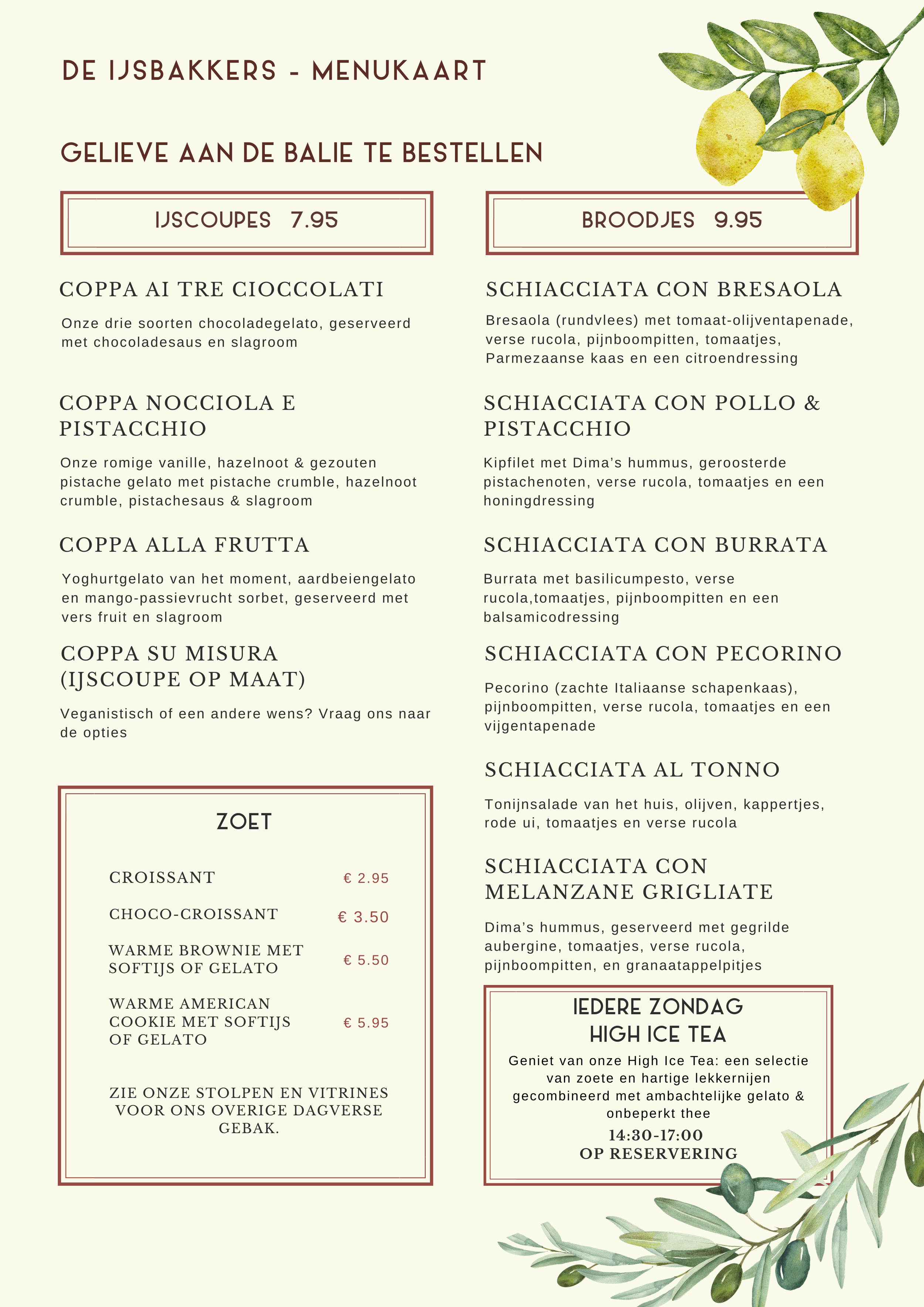 Bij De IJsbakkers beleef je de ultieme Italiaanse smaakbeleving. Wij serveren niet alleen authentieke, ambachtelijke gelato, maar ook een gezonde en smaakvolle lunch. Onze lunchkaart biedt diverse opties, waaronder de populaire Schiacciata – een luchtige broodspecialiteit uit het zuiden van Italië.